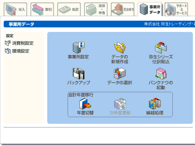 2)いろいろ・・・事業所の設定と領域のバックアップ/新規作成/選択ができる